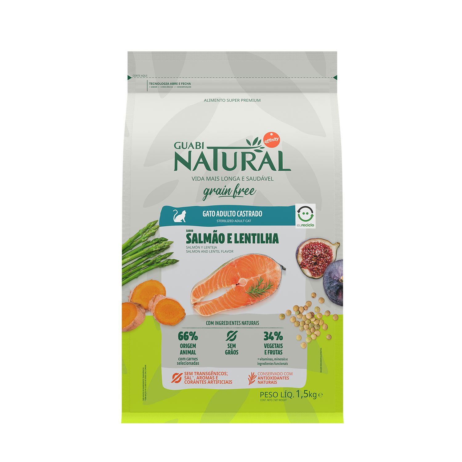 Seleção de Ingredientes de Origem Animal, mín. 66% (dos quais mín. 16% são Carnes Selecionadas: Carne Mecanicamente Separada de Salmão, Carne Mecanicamente Separada de Frango e Fígado de Frango; Farinha de Vísceras de Aves, Farinha de Torresmo, Ovo em Pó, Óleo de Vísceras de Aves, Gordura Suína, Óleo de Peixe Refinado, Hidrolisado de Fígado Ave e Suíno). Seleção de Vegetais, Frutas, Vitaminas, Minerais e Ingredientes Funcionais, máx. 34% (Lentilha, Farinha de Mandioca, Aspargo Desidratado, Figo Desidratado, Mirtilo Desidratado “Blueberry”, Amora Desidratada, Maçã Desidratada, Manga Desidratada, Farinha da Alga Schizochytrium sp., Semente de Psyllium, Polpa de Beterraba, Fibra de Cana-de-Açúcar, Levedura Seca de Cervejaria, Óleo de Linhaça, Cloreto de Potássio, Carbonato de Cálcio, Cúrcuma, Aditivos Prebióticos: Inulina e Parede Celular de Levedura Fonte de Mananoligossacarídeos, L-Lisina, L-Carnitina, Taurina, DL- Metionina, Propionato de Cálcio, Sorbato de Potássio, Aditivo Acidificante: Ácido Fosfórico, Antioxidantes Naturais: Extrato de Alecrim e Concentrado de Tocoferóis, Aditivo Adsorvente: Parede Celular de Levedura e Bentonita, Vitaminas: A, D3, E, K3, C, B1, B2, B6, B12, Pantotenato de Cálcio, Ácido Fólico, Ácido Nicotínico, Biotina, Cloreto de Colina; Minerais: Sulfato de Zinco, Sulfato de Ferro, Sulfato de Manganês, Iodato de Cálcio; Minerais Quelatados: Proteinato de Manganês, Levedura Enriquecida com Selênio, Proteinato de Zinco, Proteinato de Cobre).