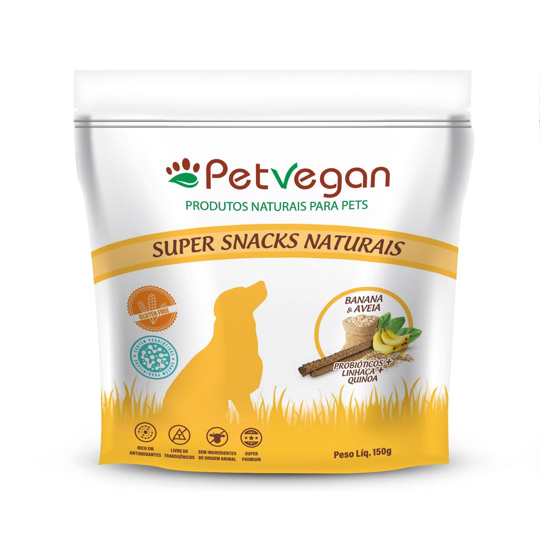Os snacks PetVegan são elaborados com ingredientes funcionais, ou seja, saúde com sabor! A banana é rica em potássio e colabora no fortalecimento dos ossos e músculos. Os biscoitos contêm probióticos, suplementos gerados por bacillus vivos que auxiliam para o intestino saudável, maior absorção de nutrientes e aumento da imunidade. Contém linhaça e aveia para pele, pelos saudáveis e quinoa que possui alto teor de ferro e proteínas. São a melhor opção para recompensar os cães ou demonstrar carinho, de forma nutritiva e natural!